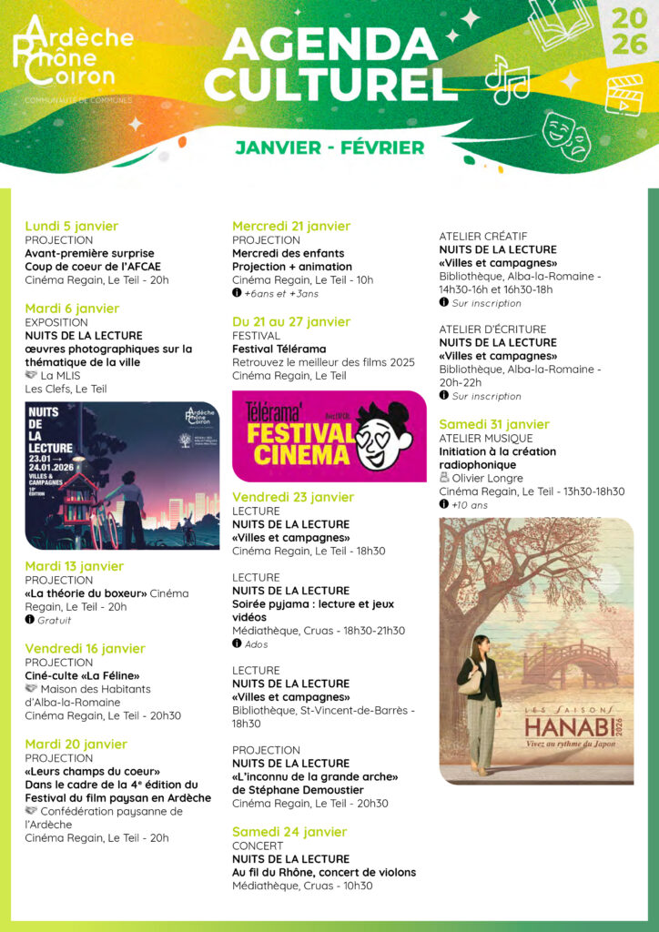 Retrouvez vos rendez-vous culturels sur les 2 premiers mois de l’année 2026.