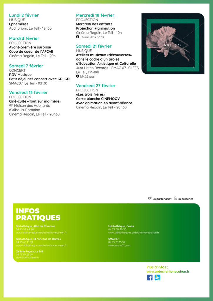 📅 Planifiez à l’avance ou trouvez des sorties de dernières minutes : projections de films, animations, ateliers, lectures, spectacles…